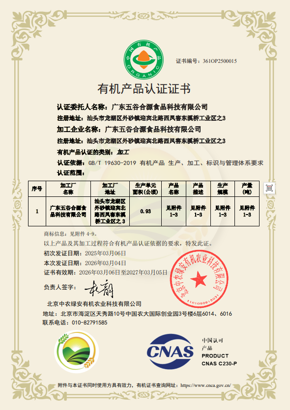 在食品安全与健康消费日益受到重视的背景下,"有机认证"已成为消费者和采购方评估食品企业品质能力的重要参考维度。然而,有机资质并非一张贴在包装上的标签,它背后折射的是一家企业在原料管控、生产工艺、质量体系等方面的系统性投入。广东五谷合源食品科技有限公司(以下简称"五谷合源")在谷物健康食品领域深耕多年,其有机资质的获取与维护,是理解这家企业综合实力的重要切口。